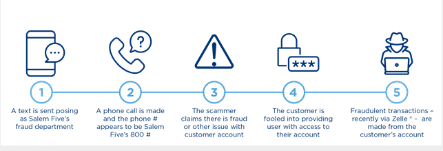 Salem Five is also here to help! If you believe you have been a target of a scam, or have provided someone with your account or online banking information, contact us immediately at (800) 850-5000.